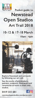 Studios will be open from 10am to 4pm Saturday and Sunday the 18 & 19th and 25th & 26th of March. This really is a special opportunity to see these authentic local artists in their natural habitat and see or perhaps even purchase some of their latest creations. Some have longer opening hours. Check out the details about each studio at newsteadopenstudios.wordpress.com and get your guide/map from the website, from Dig Cafe or Red Door Gallery both in the heart of Newstead. Or find us on Facebook and Instagram.