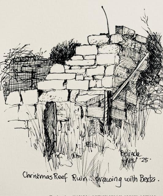 When drawing I draw directly with my pens, focus on my breath and draw the scenes around my home in Strangways. I include snippets of text to remind me of the moment, of things unseen but felt that deepen my connection to the landscape.
